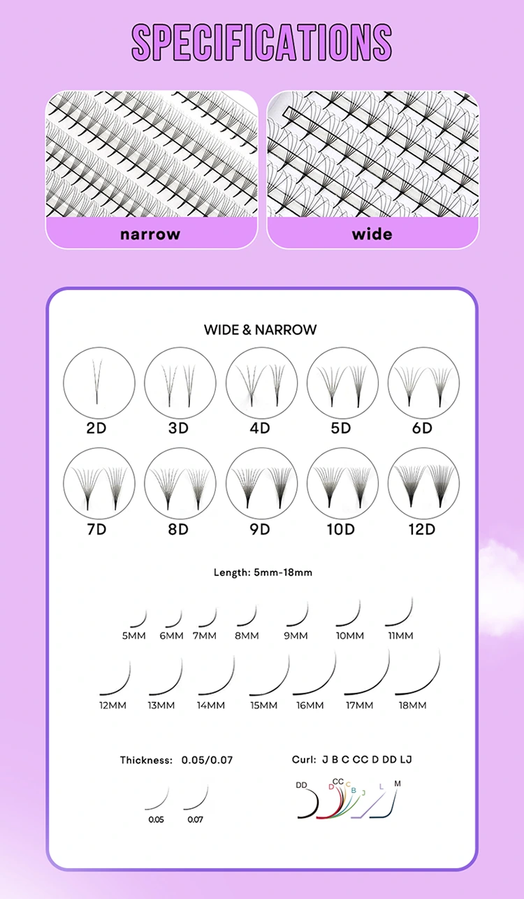 SP Eyelash ofrece una amplia gama de opciones de densidad para 500 ventiladores de volumen de la bandeja de las pestañas de 3D a 20D, así como tipos de rizos como J, B. C, CC, D, DD, L y M. También ofrecemos opciones de ventilador de longitud mixta. Esta diversidad le permite crear varios estilos de pestañas para adaptarse a diferentes ocasiones. Estas pestañas están hechas a mano desde el material PBT de la más alta calidad, asegurando la suavidad, el color profundo y la confiabilidad, proporcionándole una experiencia de uso cómodo y un efecto duradero. SP Eyelash proporciona el mejor servicio postventa, incluida la personalización del logotipo, las opciones mayoristas y la resolución rápida de problemas.