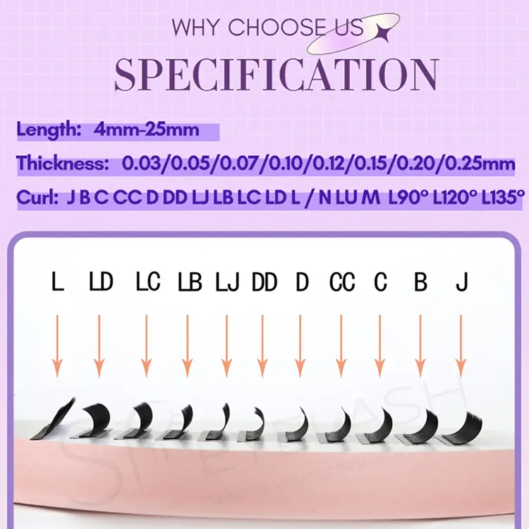 SP Eyelash Silk Russian Laser admite servicios de personalización profunda, que ofrece opciones de grosor de 0.03-0.25 mm y longitud única personalizable de 6-25 mm (compatible con la coincidencia de tamaño mixto). Múltiples tipos de rollo (j/b/c/cc/d/dd/l/lc/ld/m, etc.) para cumplir con diferentes requisitos operativos.