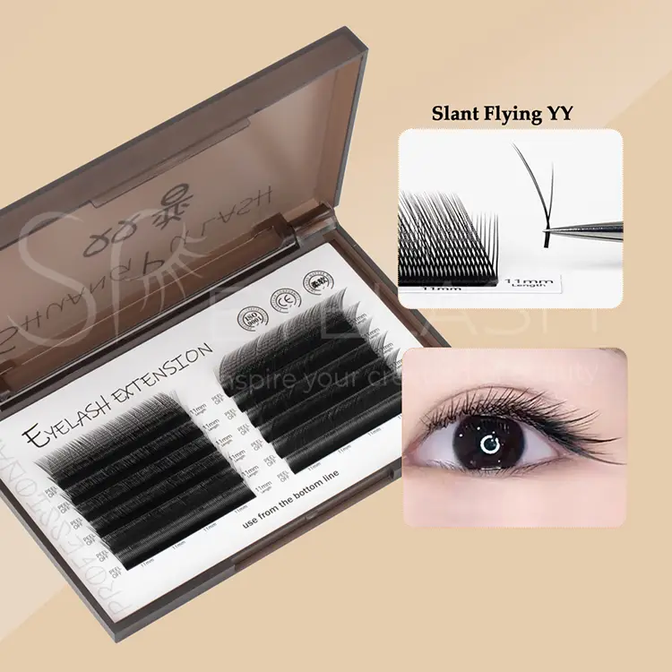 SP Eyelash Slant Fly Yy Shape Las pestañas está hecha de material de fibra PBT coreana y logra 4-6 semanas de rizado duradero a través de tecnología de conformación de alta temperatura. Cada pestaña está tejida a mano, con una base lisa y libre de adhesivo, y una estructura 3D para garantizar el grosor y la no adhesión. Certificado por SGS, CE y vegano, no contiene ingredientes irritantes como el formaldehído y es adecuado para la piel del ojo sensible.